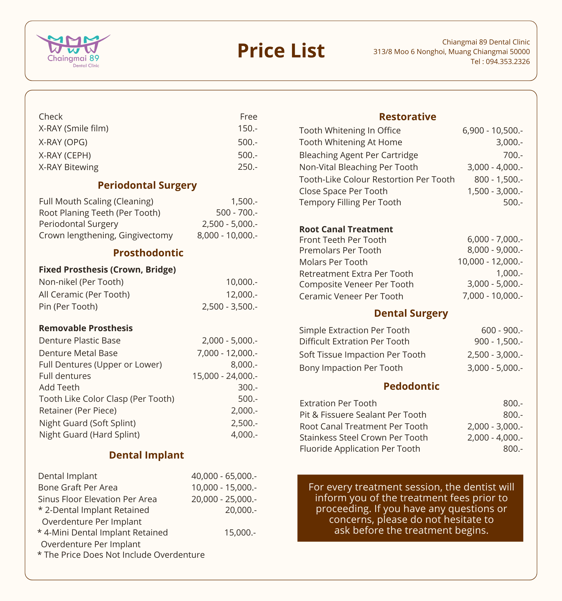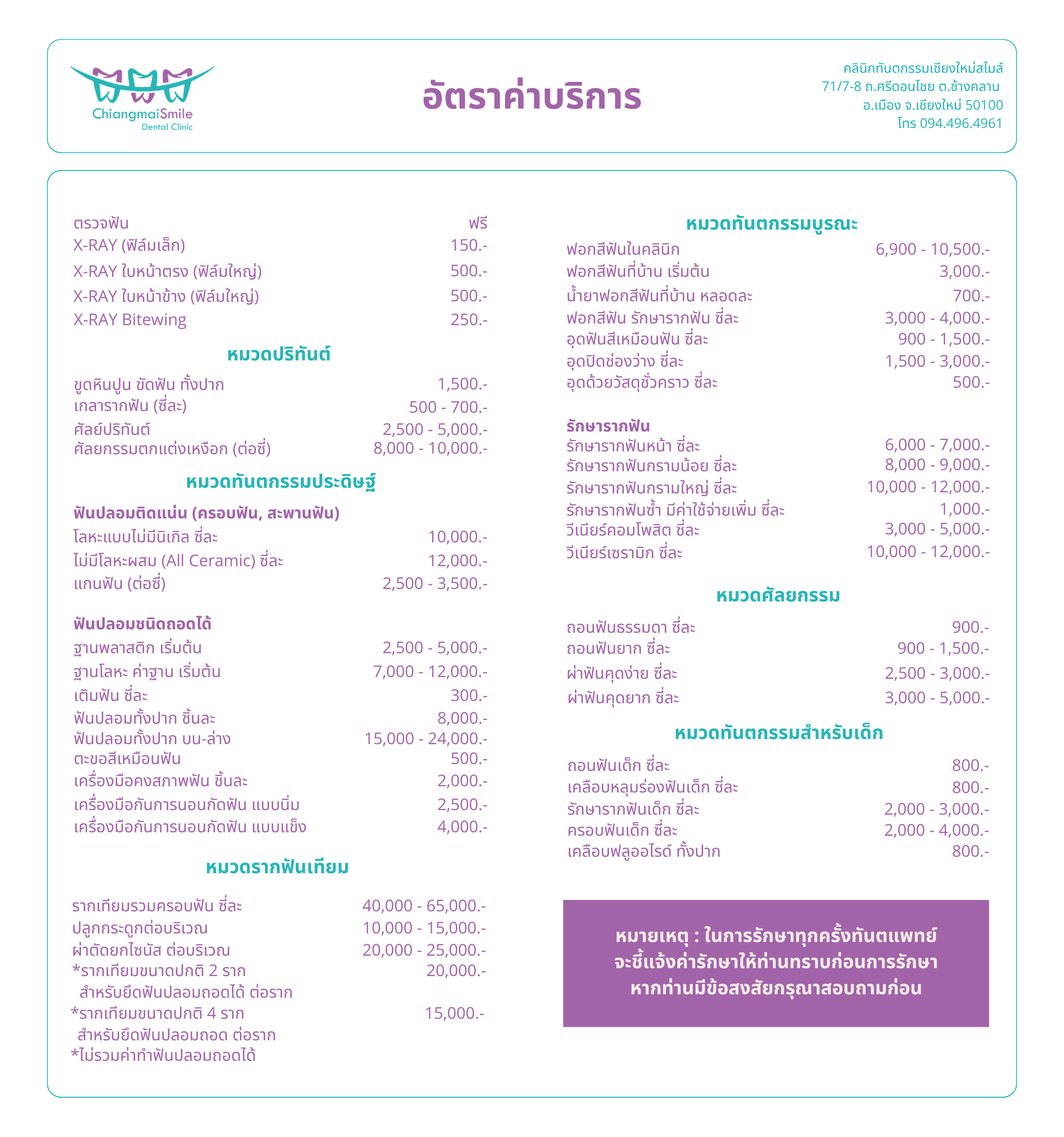 ในการรักษาทุกครั้งทันตแพทย์จะชี้แจ้งค่ารักษาให้ท่านทราบก่อนการรักษา หากท่านมีข้อสงสัยกรุณาสอบถาม